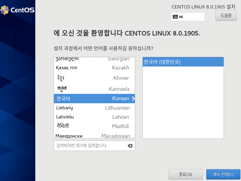 맨 위 ‘Install CentOS Linux 8.0.1905’선택