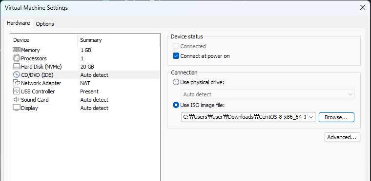 여기서 CD/DVD(IDE)를 클릭하고 Connection란에 맨 아래 Use ISO image file에서