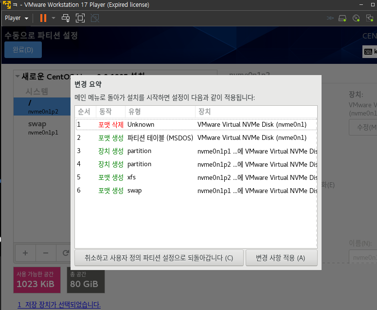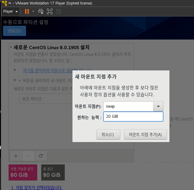 마운트 지점에 ‘swap’이라고 입력해주고, 용량은 약 20GB로 설정해줬다.