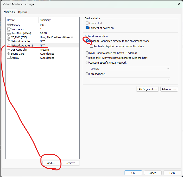 Add > Network Adapter2 추가 >> Network Adapter2 Bridged 체크