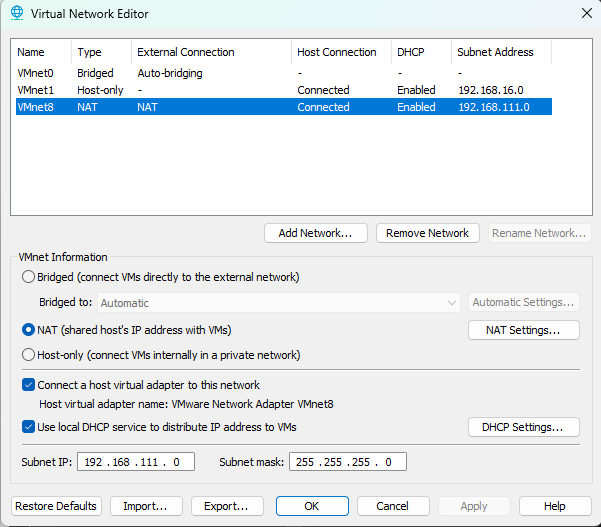 VMnet8 IP대역을 192.168.111.0으로 변경