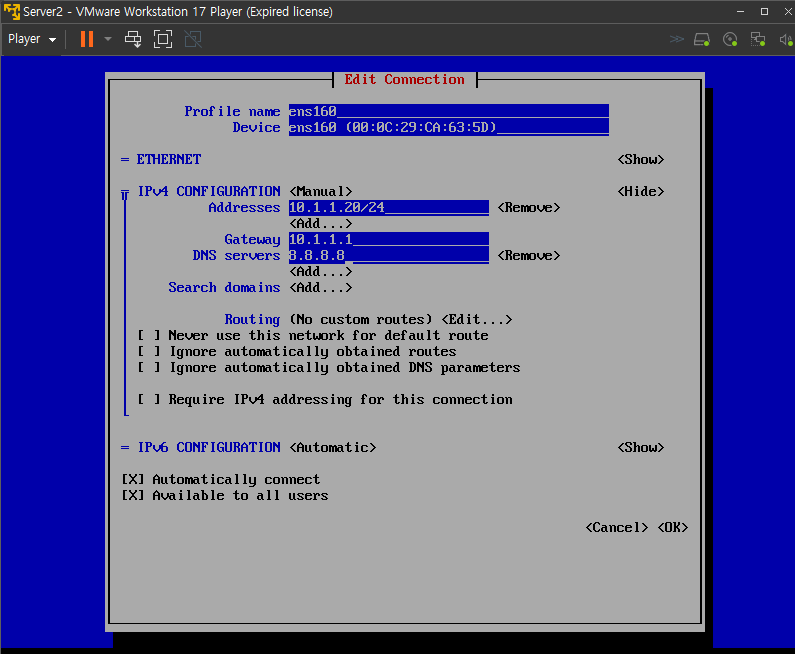 4) nmtui edit ens160 >> 바로 ens160 랜카드 설정으로 접속 됨.